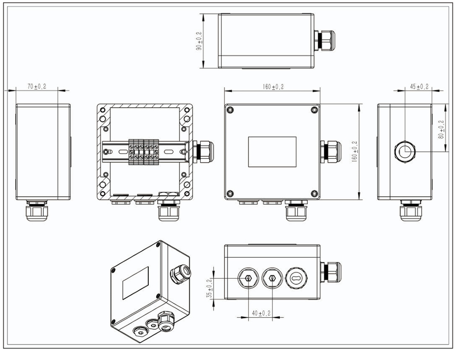 | Polyester housing: 160mm (W) × 160mm (H) × 90mm (D) 1- PTBM junction box 160 specification housing, bottom with 6-M20×1.5 holes 6-M20×1.5 explosion-proof cable glands (round, PA66 material) 3- UK10N or equivalent terminal blocks 2- USLKG10 or equivalent grounding terminals | 1ESF、3ESF |